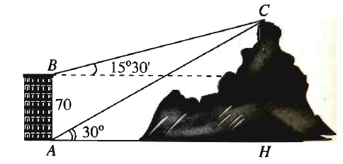 Câu 2: (1 điểm) Từ hai vị trí \(A\) và \(B\) của một tòa nhà, người ta quan sát đỉnh \(C\) của ngọn núi. Biết rằng độ cao \(AB = 70{\rm{m}}\), phương nhìn \(AC\) tạo với phương nằm ngang góc \({30^0}\), phương nhìn \(BC\) tạo với phương nằm ngang góc \({15^0}30’\). Tìm độ cao của ngọn núi đó có độ cao so với mặt đất.