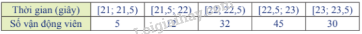 Ta có: x1; …; x5 ∈ [21; 21,5), x6; …; x17 ∈ [21,5; 22), x18; …; x49 ∈ [22; 22,5), x50; …; x94 ∈ [22,5; 23), x95; …; x124 ∈ [23; 23,5).