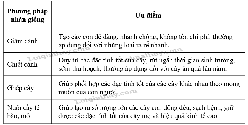 | Nêu ưu điểm của các phương pháp nhân giống giâm cành, chiết cành, ghép cây, nuôi cấy tế bào và mô thực vật. |