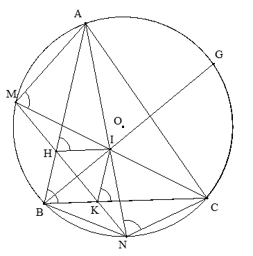 Cho đường tròn (O) ngoại tiếp tam giác nhọn ABC. Gọi M và N lần lượt là điểm chính giữa cung nhỏ AB và cung nhỏ BC. Hai dây AN và CM cắt nhau tại điểm I. Dây MN Cắt các cạnh AB và BC lần lươt tại các điểm H và K.