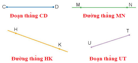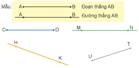 – Quan sát hình vẽ để nhận biết đoạn thẳng, đường thẳng: