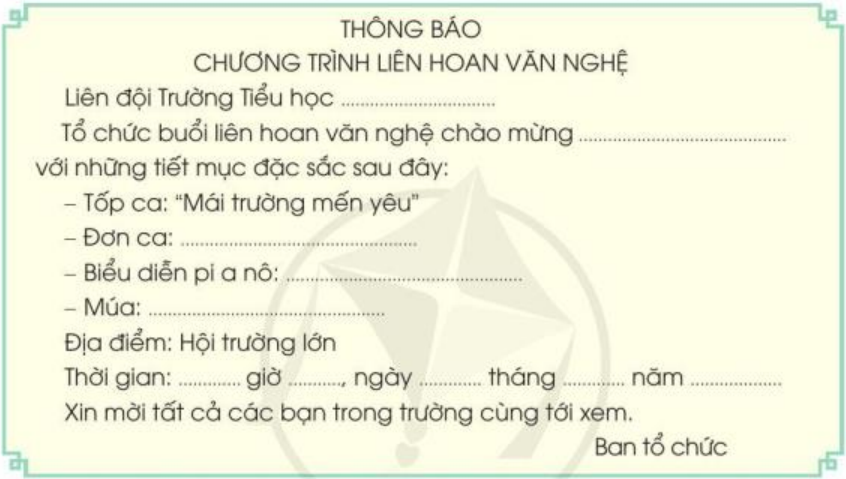Chọn 1 trong 2 đề sau. Em hãy hoàn thành thông báo dưới đây (viết vào vở). Viết đoạn văn kể về một buổi biểu diễn nghệ thuật (hoặc chiếu phim).
