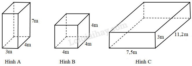 c) Hình C là hình hộp chữ nhật có chiều dài \(11,2m\), chiều rộng \(7,5m\) và chiều cao \(3m\).