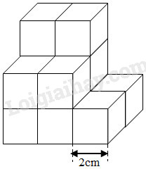 – Tính thể tích khối gỗ ta thể tích một khối lập phương nhỏ cạnh \(2cm\) nhân với \(12\) (vì khối gỗ được ghép bởi \(12\) hình lập phương nhỏ).