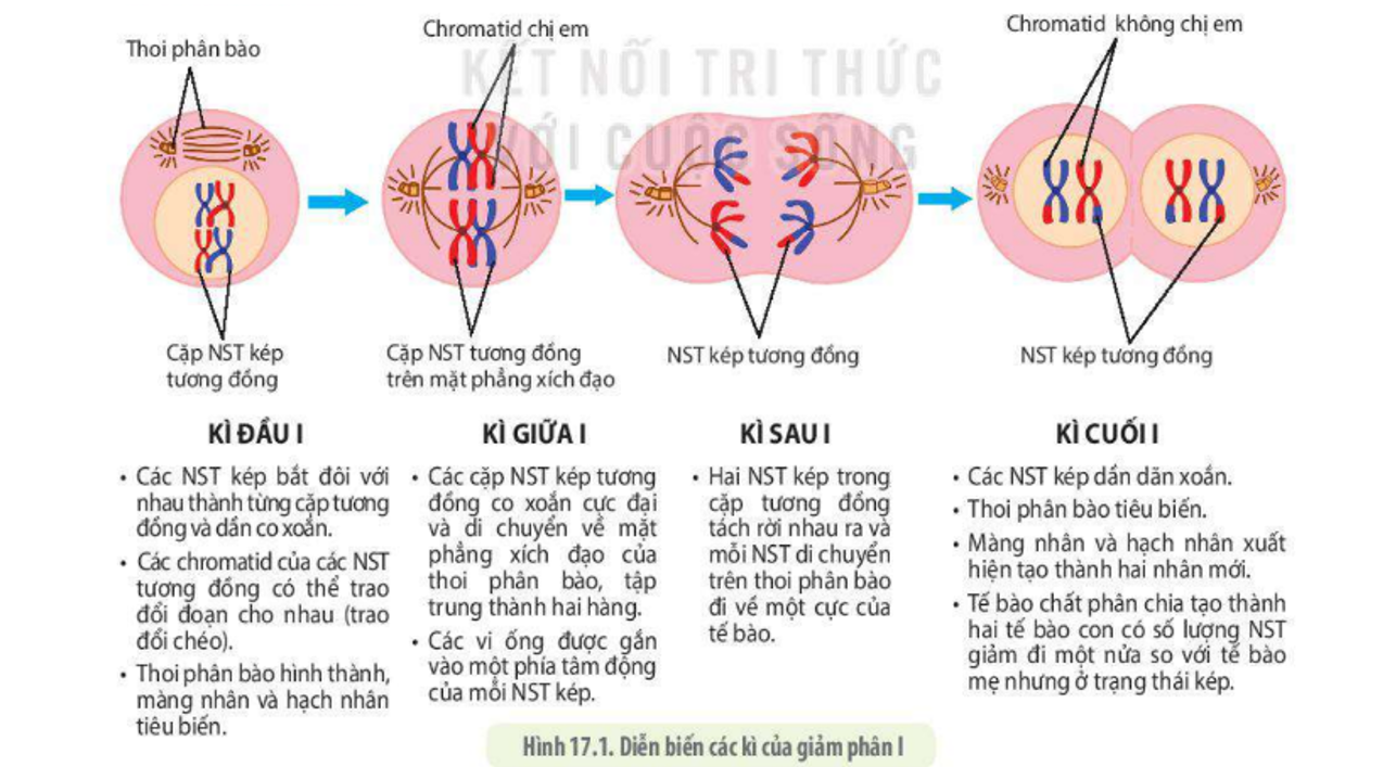 Giảm phân gồm hai lần phân bào liên tiếp là giảm phân I và giảm phân II. Mỗi lần phân bào đều có đủ 4 kì: kì đầu, kì giữa, kì sau và kì cuối.