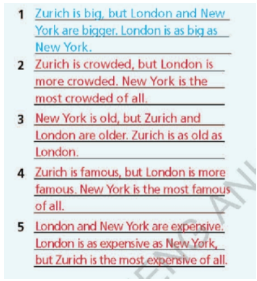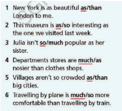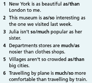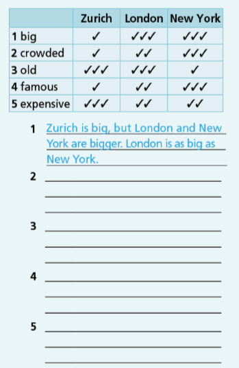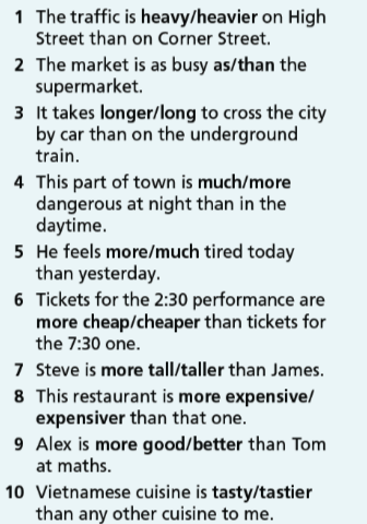 56. Write the comparative form of the adjectives below. 57. Choose the correct option.58. Complete the sentences with the adjectives in brackets in the comparative form.59. Complete the text with the adjectives in brackets in the superlative form. 60. Complete the sentences with the adjectives in brackets in the superlative form. 61. Look at the table and write sentences about the cities as in the example. 62. Choose the correct answer.63. Fill in each gap with like, the same as or different fro