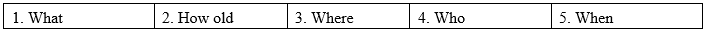 Từ để hỏi (Question words): who (ai), what (cái gì), where (ở đâu), when (khi nào), how old (bao nhiêu tuổi).