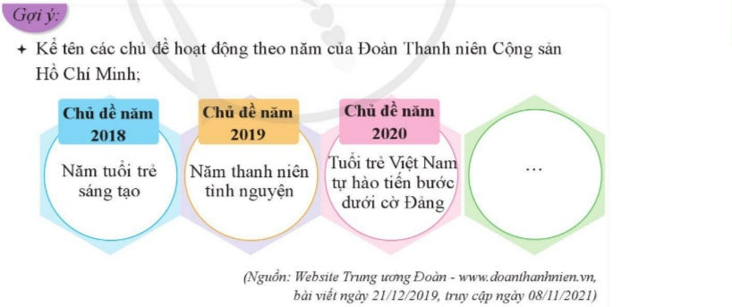 + Em hãy tìm hiểu và kể tên một số hoạt động của Đoàn Thanh niên trong những năm qua: Chủ đề năm bao nhiêu? Tên chủ đề là gì?