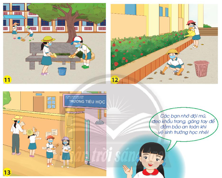 Thực hiện vệ sinh các khu vực trong khuôn viên nhà trường hoặc xung quanh trường theo sự hướng dẫn của thầy, cô giáo.