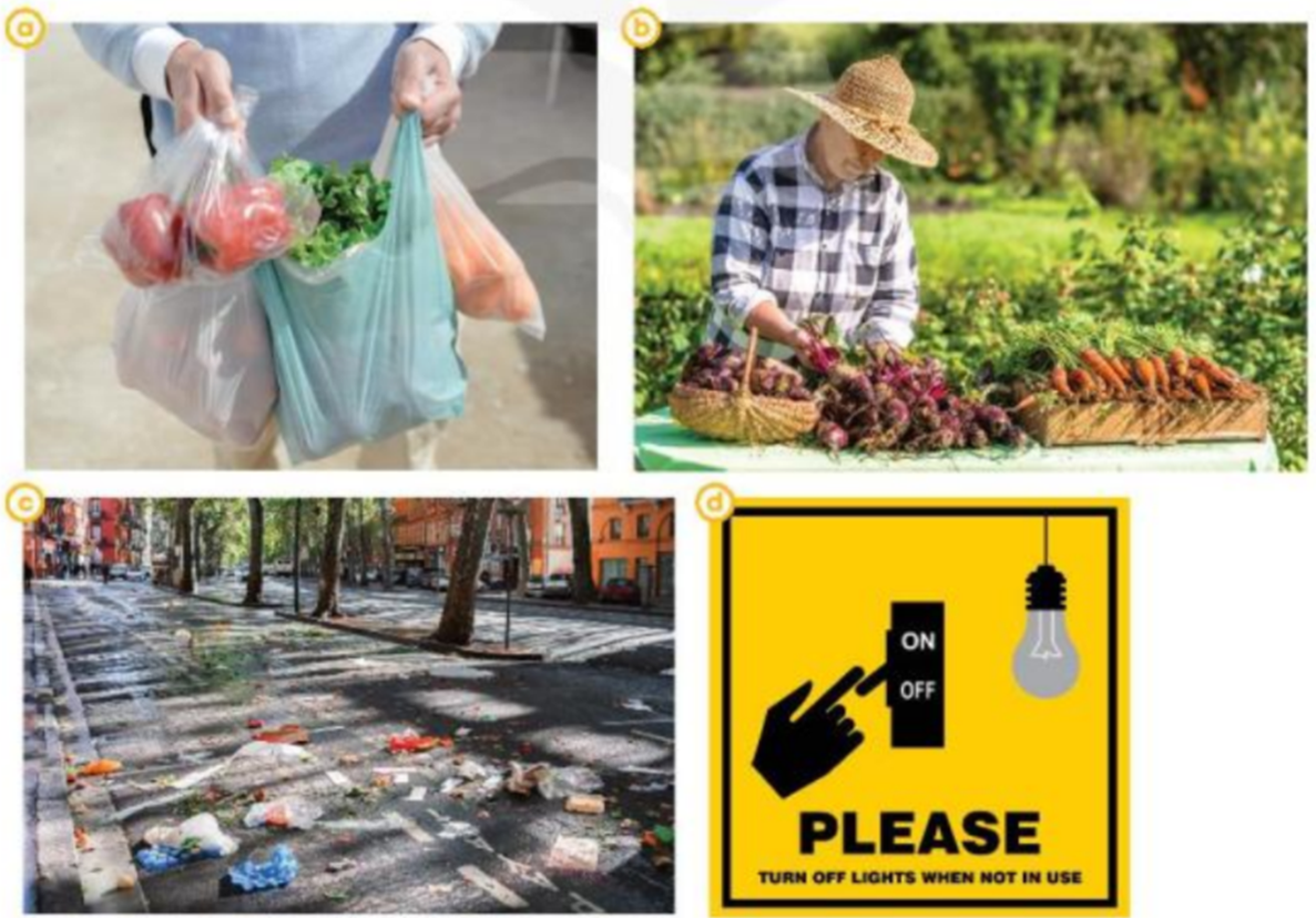 (Hình b, d thể hiện lối sống xanh. Trong hình b, người đàn ông đang thu hoạch rau đựng trong giỏ thay vì dùng túi ni lông. Trong hình d, biển báo cho chúng ta thấy hành động tiết kiệm điện, giúp cuộc sống và môi trường của chúng ta xanh hơn.)