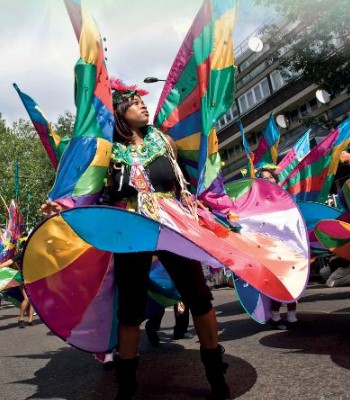 (Cô ấy đang mặc trang phục đầy màu sắc.)