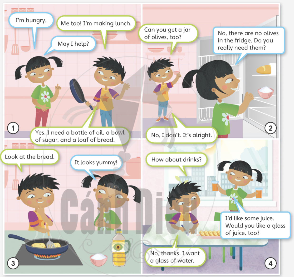 (Andy đang nấu ăn. Anh ấy muốn một chai dầu và một ổ bánh mì.)