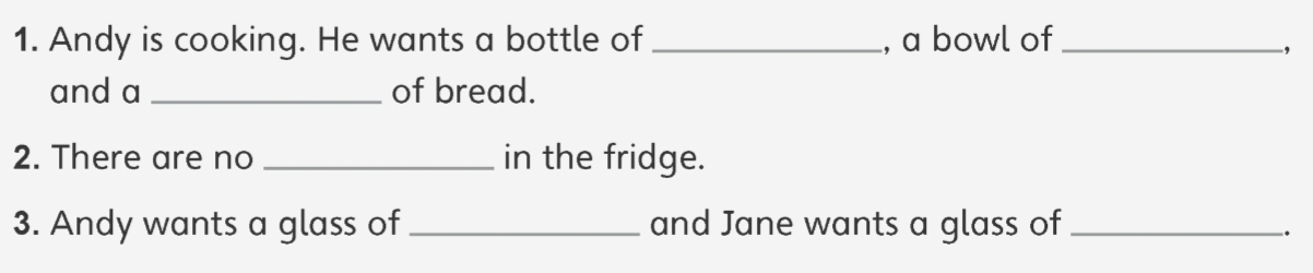 1. Andy is cooking. He wants a bottle of oil, a bowl of sugar and a loaf of bread.