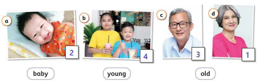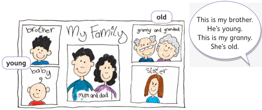 (Đây là anh trai tôi. Anh ấy còn trẻ. Đây là bà của tôi. Bà đã già rồi.)