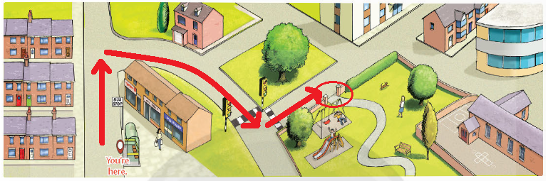 Chỉ đường từ trường: Rẽ trái tại trường Đi thẳng đến đèn giao thông cạnh công viên. Rẽ trái và đi bộ đến thư viện. Rẽ trái tại siêu thị. Đi thẳng. Nhà tớ ở giữa công viên và thư viện.