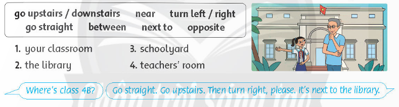 (Chọn một địa điểm ở trường và chỉ đường cho một người bạn.)