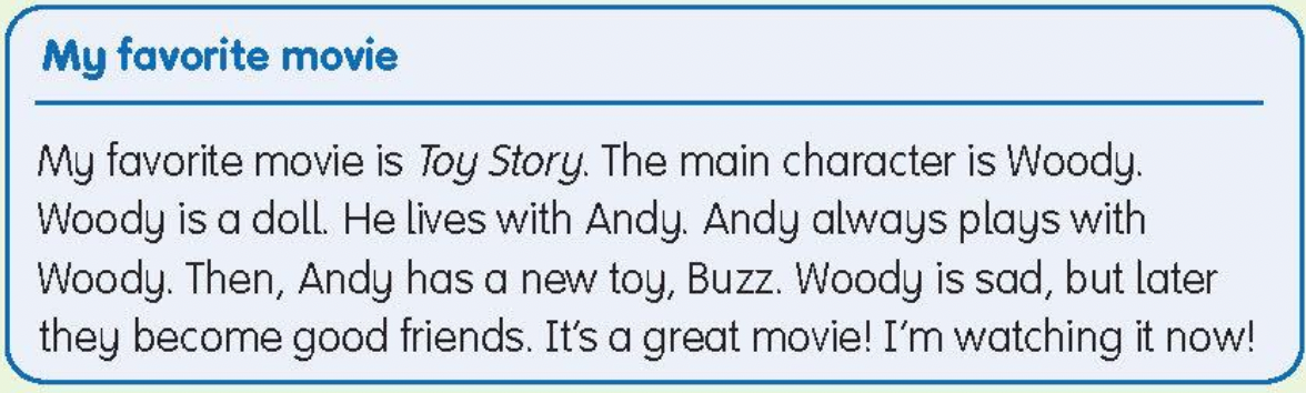 Bộ phim yêu thích của tôi là Toy Story. Nhân vật chính là Woody. Woody là một con búp bê. Anh ấy sống với Andy. Andy luôn chơi cùng Woody. Sau đó, Andy có một món đồ chơi mới, Buzz. Woody rất buồn nhưng sau đó họ trở thành bạn tốt của nhau. Đó là một bộ phim tuyệt vời! Bây giờ tôi đang xem nó đây!