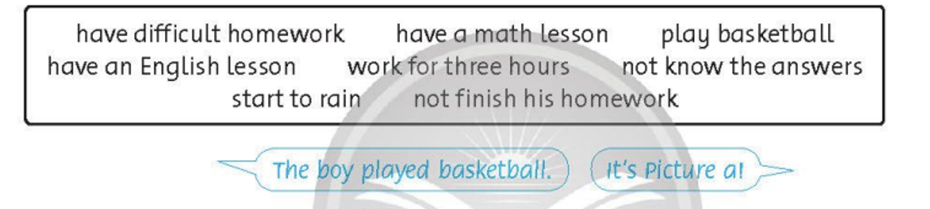 Listen and write the numbers. Look at the picture and say. Say what you did at school yesterday. Write about your last vacation. Use the example to help you.