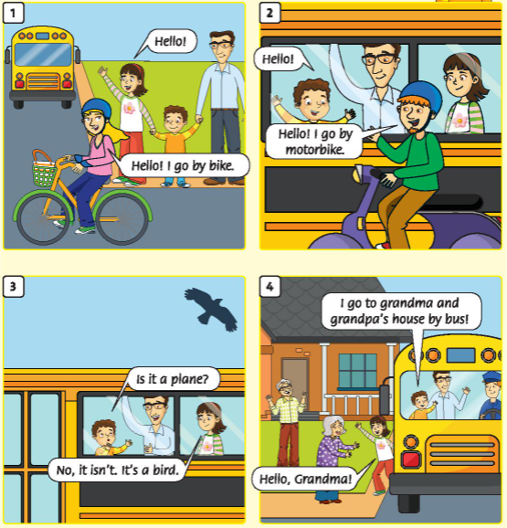B: I go to grandma and grandpa’s house by bus!