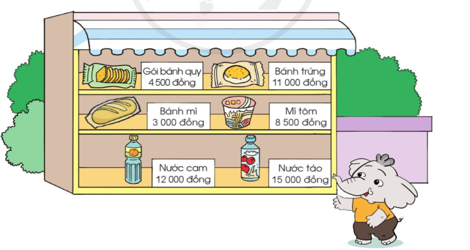 Chọn một mặt hàng em muốn mua ở bức tranh sau rồi tính xem nếu mua mặt hàng đó với số lượng là 5 thì cần trả bao nhiêu tiền?