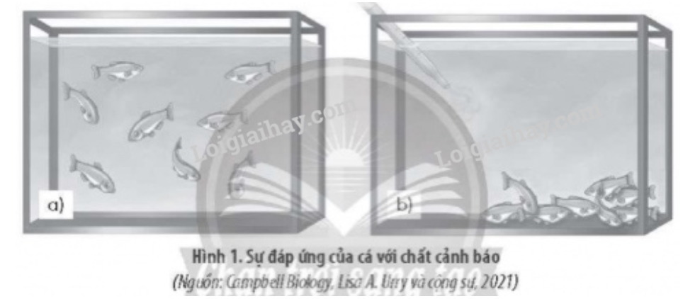 Người ta tiến hành một thí nghiệm (Hình 1) như sau: Thả một đàn cá vào trong bể nuôi, các con cá di chuyển tự do trong bể (a). Sau đó, một chất cảnh báo được bơm vào trong bể. Sau vài giây, cả đàn cá đã tập trung lại dưới đáy bể nuôi (b). Hãy giải thích hiện tượng trên. Việc đàn cá tập trung lại có ý nghĩa gì?