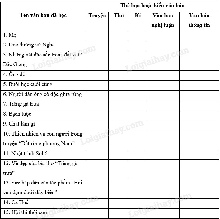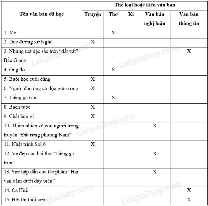 Xác định văn bản cụ thể đó thuộc tiểu loại hay kiểu văn bản nào thì ghi số thứ tự vào cột bên phải