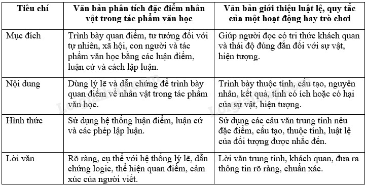 (Câu hỏi 7, SGK) Nêu một số điểm khác biệt giữa văn bản phân tích đặc điểm nhân vật trong tác phẩm văn học với văn bản giới thiệu quy tắc, luật lệ của một hoạt động hay trò chơi (Gợi ý: về mục đích, nội dung, hình thức, lời văn,…)