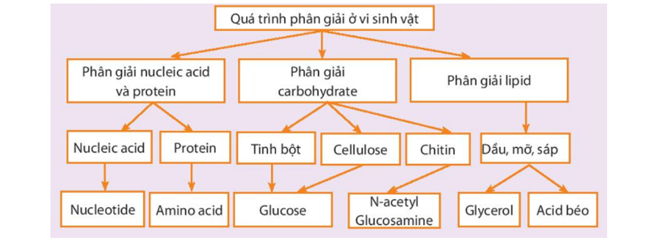 Vi sinh vật phân giải 4 phân tử hữu cơ chính là phân giải carbohydrate, proteinlipidnucleic acid.