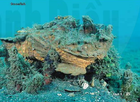 Do you know that some animals are camouflaged? This means their color is the same as the colors around them. Some camouflaged animals hide in seaweed, rocks, and sand. Look at the photo on the left. This looks like seaweed, but it’s not! It’s the leafy seadragon. It hides in the seaweed. It’s the same color as seaweed. Like the seaweed, its body is also in the shape of a leaf. Look at the photo below. This is a stonefish. It hides on the sand, near rocks. It looks like a rock. Where are its eyes and its mouth?