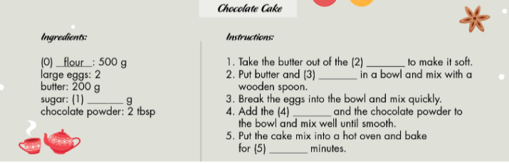 (Bạn sẽ nghe một người phụ nữ trên đài nói về cách làm một chiếc bánh. Nghe và điền vào chỗ trống. Bạn sẽ nghe thông tin hai lần.)