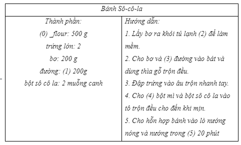 Hôm nay chúng ta đang làm một chiếc bánh sô cô la. Chúng ta cần 500 gam bột mì, hai quả trứng lớn, 200 gam bơ, 200 gam đường và hai thìa bột sô cô la. Lấy bơ ra khỏi tủ lạnh để bơ mềm. Sau đó cho vào bát cùng với đường trộn đều. Dùng thìa gỗ đập trứng vào bát rồi trộn với bơ và đường. Trộn nó rất nhanh bằng thìa gỗ. Sau đó cho bột mì và bột sô cô la vào trộn đều cho đến khi được hỗn hợp mịn. Cho hỗn hợp bánh vào lò nướng nóng của bạn và nướng trong 20 phút. Khi hoàn thành, bạn lấy bánh ra và để nguội. Sau đó, bạn có thể phục vụ bánh sô cô la của bạn. Nó thực sự rất ngon.