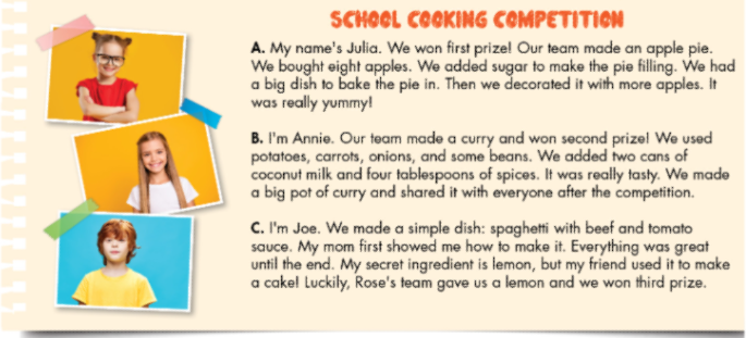 Part 1. You will hear a woman on the radio talking about how to make a cake. Listen and fill in the blanks. You will hear the information twice. Part 2. Read about the three people. Choose the correct answer (A, B, or C).