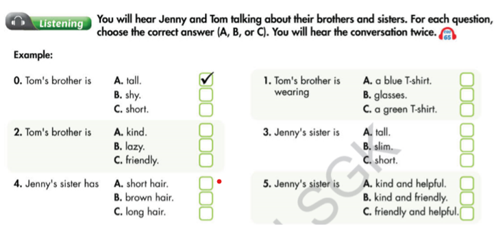(Em sẽ nghe Jenny và Tom nói về anh em trai và chị em gái của họ. Với mỗi câu hỏi, chọn câu trả lời đúng (A, B, hoặc C). Em sẽ nghe bài hội thoại hai lần.)