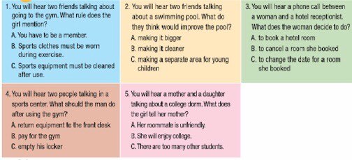 (Bạn sẽ nghe năm cuộc trò chuyện ngắn. Bạn sẽ nghe thấy mỗi cuộc trò chuyện hai lần. Có một câu