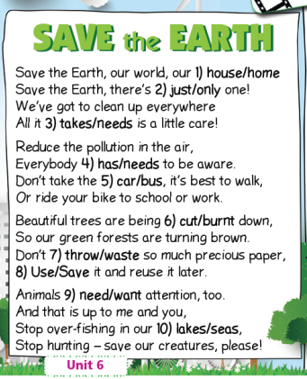 1. Listen to the song and choose the correct word. Then sing along. 2. Draw or find a picture to illustrate the song. Present your picture to the class. Explain what it means.