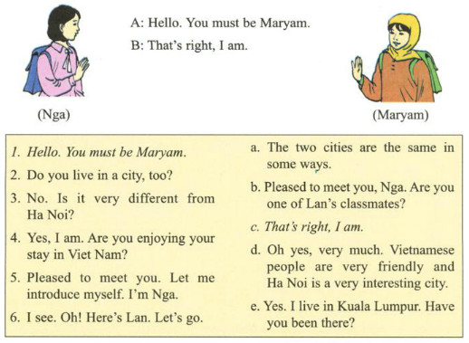 Task 1: Nga is talking to Maryam. They are waiting for Lan outside her school. Put their dialogue in the correct order and copy it into your exercise book. Then practice with your partner. Start like this: