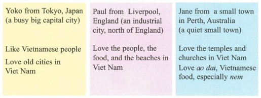 B: Mình đến từ Tokyo, Nhật Bản. Nó là một thủ đô lớn nhộn nhịp.