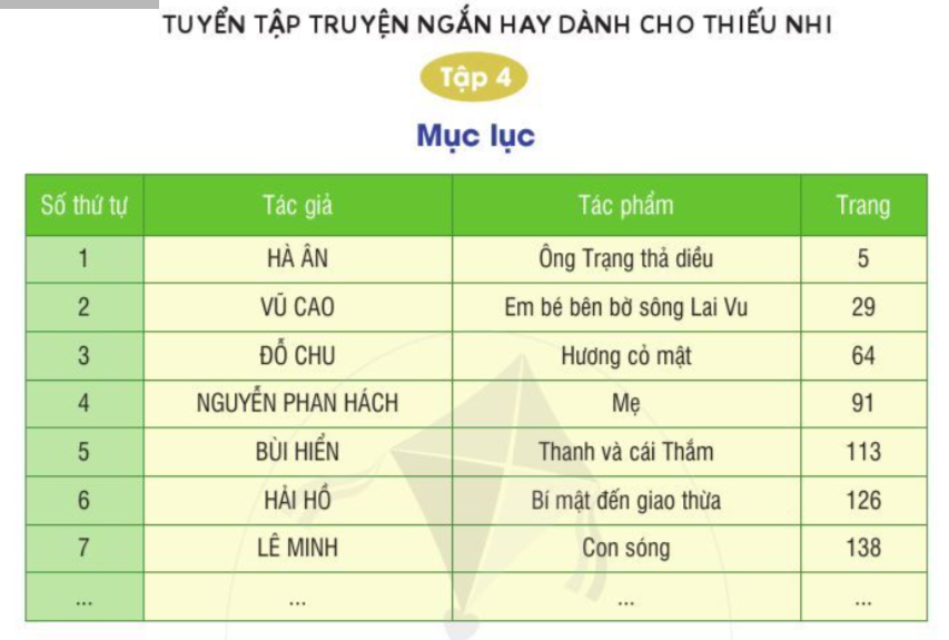 Mục lục: phần ghi tên các bài, các truyện và tác giả (nếu có nhiều tác giả) theo số trang trong sách.