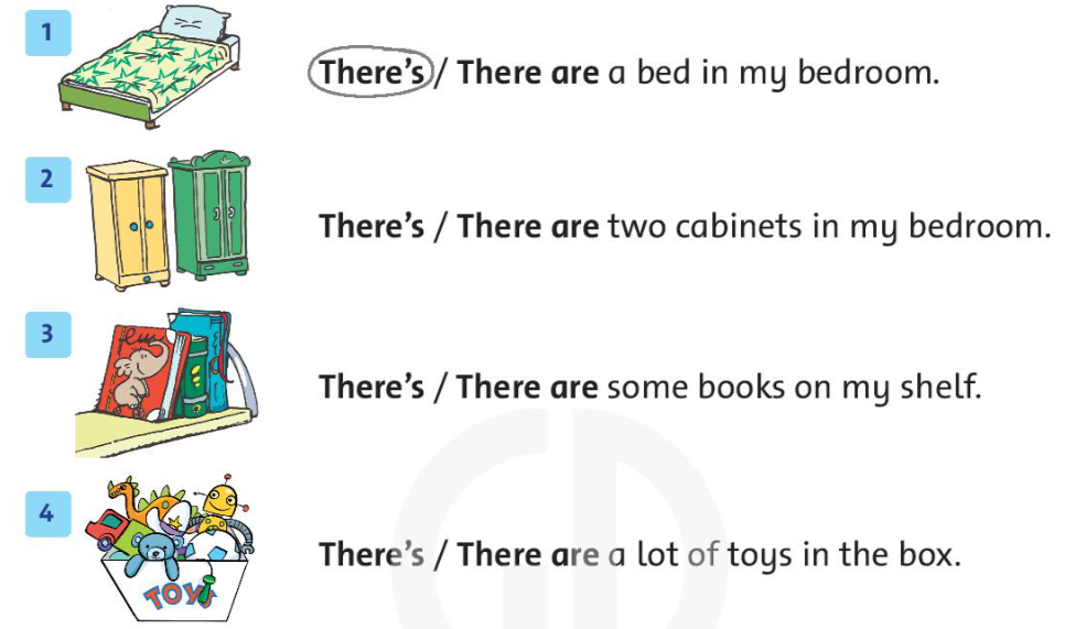 1. There’s a bed in my bedroom. (Có một cái giường trong phòng ngủ của tôi.)