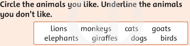 (Khoanh tròn vào con vật bạn thích. Gạch chân con vật bạn không thích.)