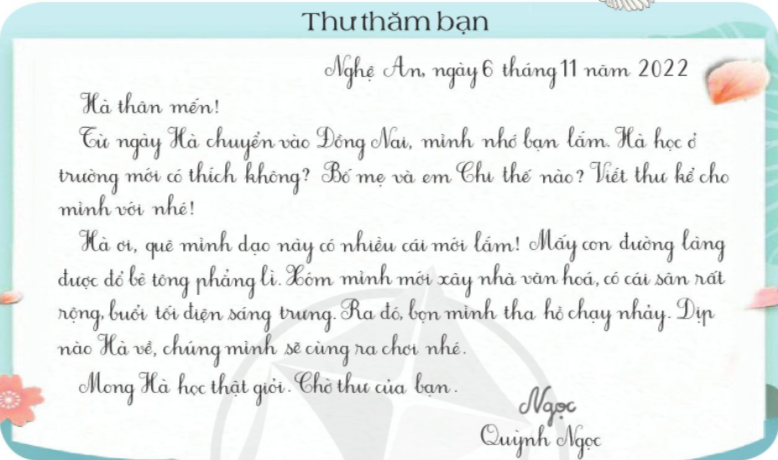 Đọc bức thư sau và trao đổi. Quỳnh Ngọc viết thư cho ai. Dòng đầu bức thư, bạn ấy viết gì. Quỳnh Ngọc hỏi thăm bạn về điều gì, kể với bạn những gì. Cuối bức thư, Quỳnh Ngọc viết gì. Hãy đóng vai bạn Hà, viết một bức thư trả lời Quỳnh Ngọc.