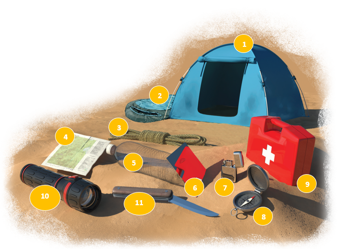 THINK! You’re lost in the desert. What is your first priority? 1. Match objects 1–11 in the picture with the words in the box. Then listen and check. 2. Read the introduction to Desert Challenge. Which objects in exercise 1 will people probably need on a desert trek? 3. Listen to Kay Freeman talking about the survival course she went on. Which equipment from exercise 1 does she say is useful? 4. Read the questions. Then listen again and choose the correct answers. 5. USE IT! Work in pairs. Say