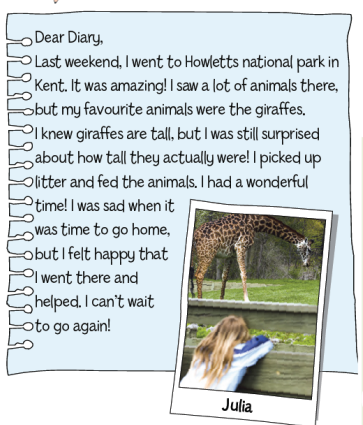 Imagine you went on a volunteering holiday to a national park. Write a diary entry about your experiences there (about 60-80 words). Include the name and the location of the park, what you saw/ did and your feelings.