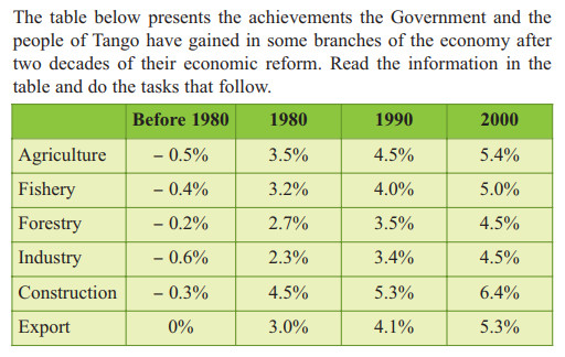 (Bảng dưới đây trình bày những thành tựu mà Chính phủ và nhân dân Tango đã đạt được ở một số ngành kinh tế sau hai thập kỷ cải cách kinh tế. Đọc thông tin trong bảng và thực hiện các tác vụ tiếp theo.)