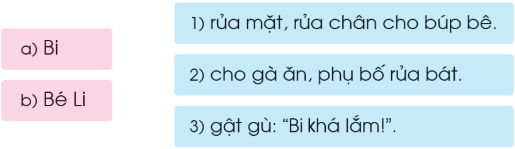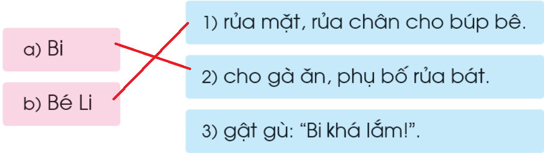Chủ nhật, bố mẹ Bi ở nhà. Mẹ làm phở bò. Bố giặt giũ. Bi chi gà ăn. Bé Li rửa mặt, rửa chân cho búp bê.