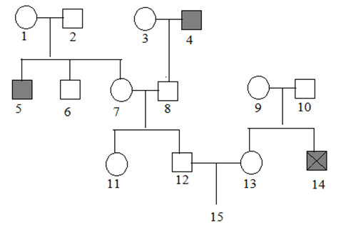 Cá thể số (4),(5) bị bệnh bạch tạng, cá thể số (14) mắc cả bệnh bạch tạng và mù màu đỏ xanh lục. biết rằng bệnh bạch tạng do gen lặn a nằm trên NST thường quy định, bệnh mù màu đỏ – xanh lục do gen b nằm trên vùng không tương đồng của NST X quy định. Xác suất cá thể số (15) không mang alen bệnh là bao nhiêu ?