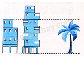Có hai toà nhà và một cái cây như hình vẽ. Biết ở mỗi toà nhà, các tầng cao bằng nhau và toà nhà cao hơn có chiều cao là 18 m. Chiều cao của cái cây là ….. m