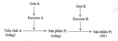 Câu 11: Sản phâm của hai gen A và B tương ứng là enzim A và enzim B.Hai enzim này xúc tác chuỗi phản ứng hình thành sắc tố đỏ theo sơ đồ dưới đây. Hai alen lặn tương ứng là a vàb không tổng hợp đưọc enzim. Mỗi locus gen nằm trên một cặp NST tương đồng khác nhau.