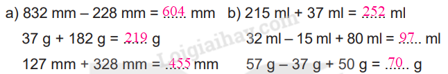 Thực hiện tính rồi viết kết quả thích hợp vào chỗ chấm.