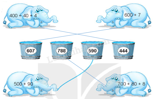 Tính nhẩm kết quả trên mỗi con voi rồi nối với số ghi trên thùng nước cho thích hợp.
